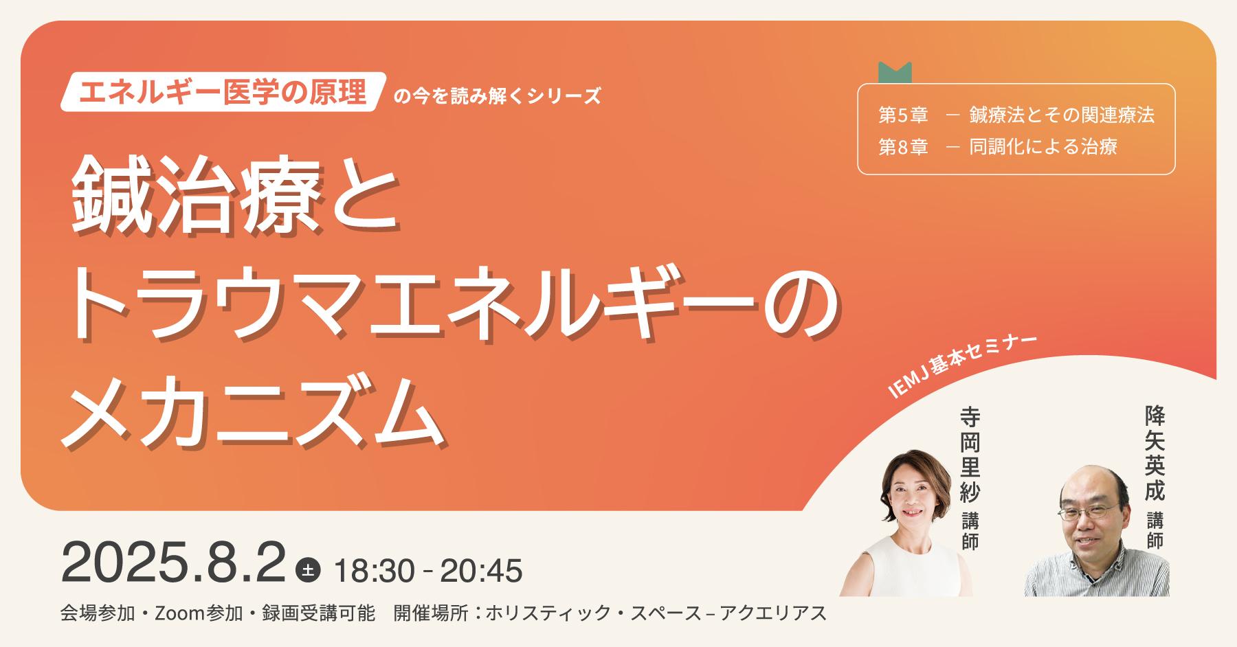 2025年8月2日【基本セミナー】鍼治療とトラウマエネルギーのメカニズム(エネルギー医学の原理:第5・8章)/寺岡 里紗・降矢 英成 |