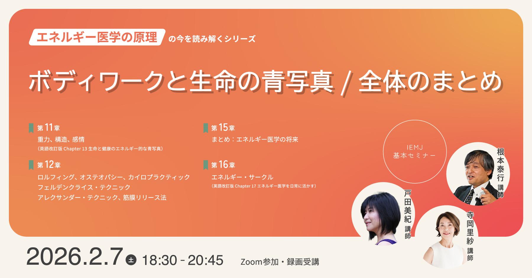 2026年2月7日【基本セミナー】筋骨格のエネルギー療法と生命と健康の青写真・全体のまとめ(エネルギー医学の原理:第11・12・15・16章)/根本 泰行・戸田 美紀・寺岡 里紗 |