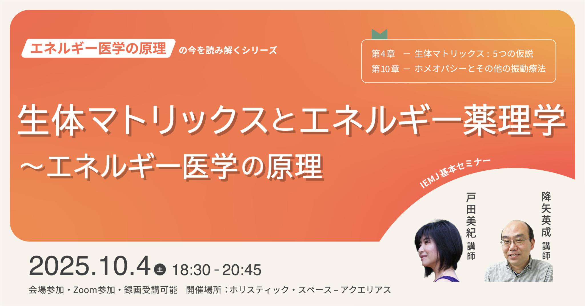 2025年10月4日【基本セミナー】生体マトリックスとエネルギー薬理学(エネルギー医学の原理:第4・10章)/戸田 美紀・降矢 英成 |